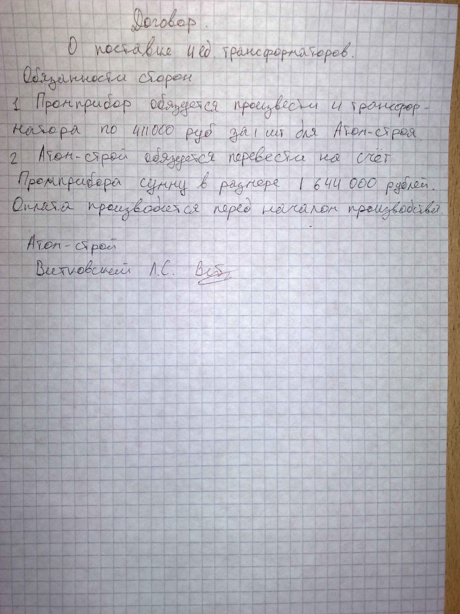 Договор между Атом-строем и Промприбором №2Из: Договора Договор между Атом-строем и Промприбором. Обязанности сторон. 1. Промприбор обязуется произвести 4 трансформатора по 411000 рублей за 1 шт для Атом-строя. 2. Атом-строй обязуется перевести на счёт Промприбора сумму в размере 1 644 000 рублей Оплата производится перед началом производства. Атомстрой. Управляющий Витковский Л.С.